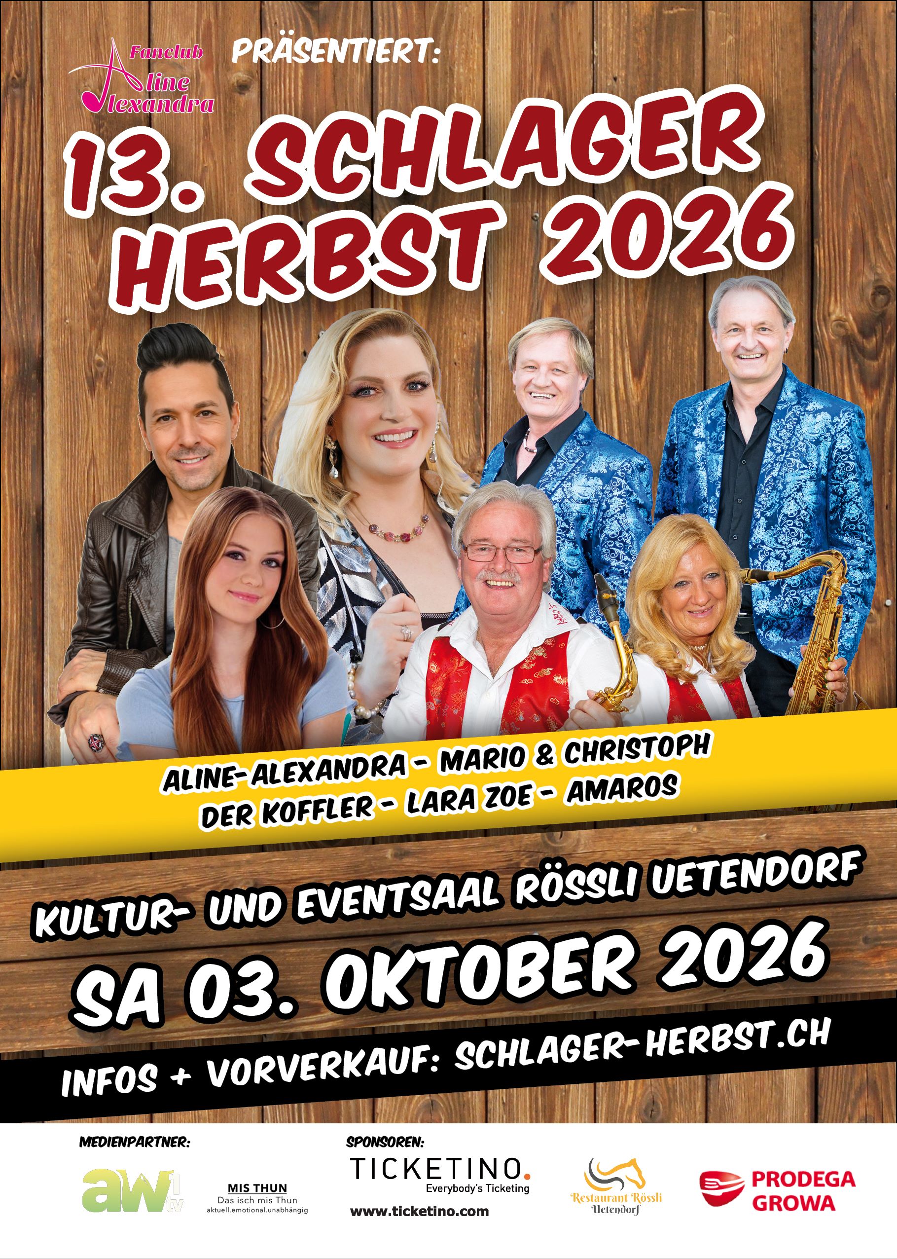 Samstag 03. Oktober 2026 17:00-00:00 | 13. Schlager Herbst 2026Fanclub Aline-Alexandra präsentiert:Aline-Alexandra (Gastgeberin), Mario und ChristophDer Koffler, Lara Zoe, Amaros